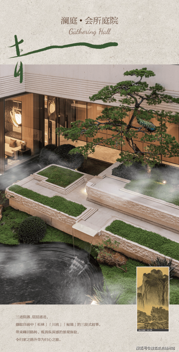 园林中最具特色的是下沉式庭院与双水院系统,以约7米高溪山流瀑、5棵造型黑松,重现《溪山行旅图》意境。景观设计不拘泥于平面,而是通过立体化的手法,将二维的山水画转译为一幅“幽深与静谧、壮丽与宁静”的立体山水画卷。高层与排屋区之间,一条长约210米的中轴景观横贯东西,保持各区域动线独立的同时,又能互相联系。