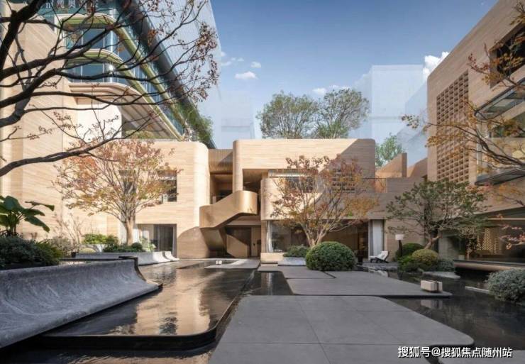 “步入洋房区,城市的喧嚣被瞬间屏蔽,迎面而来的是极具私密感的‘琉光水院’。以深邃的深绿色奢石铺陈水底,一侧矗立着极具流动感的特色艺术灯具,宛如庄园里凝固的时光飘带。它不仅是一处水景,更是洋房区客户高雅品味的象征。在潺潺流水与繁茂林木的掩映下,建筑的玻璃幕墙倒映着天光云影。在这里,每一次归家,都是一次从繁华向内心的隐奢回归。