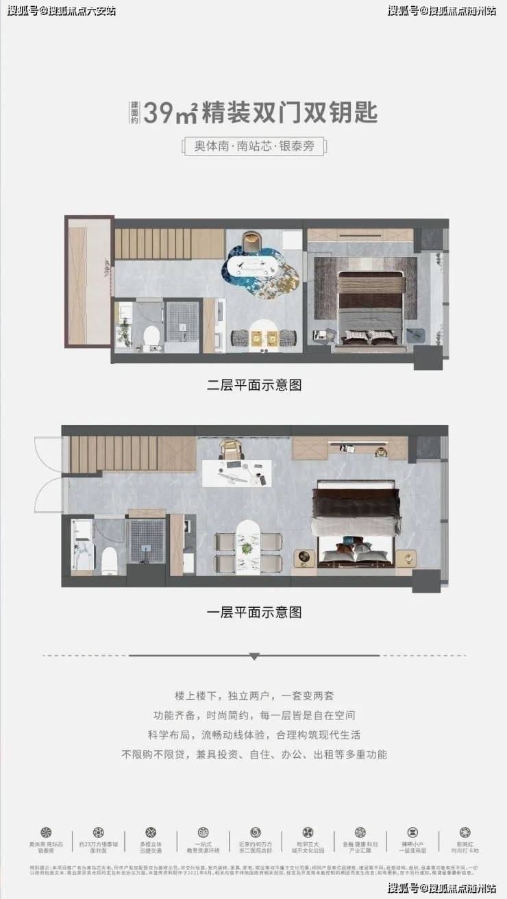 精装双门双钥匙,层高约4.5米,买一层享两层,小面积低总价,兼具投资、自住、办公、出租、养老多重功能,准现房收益可期。