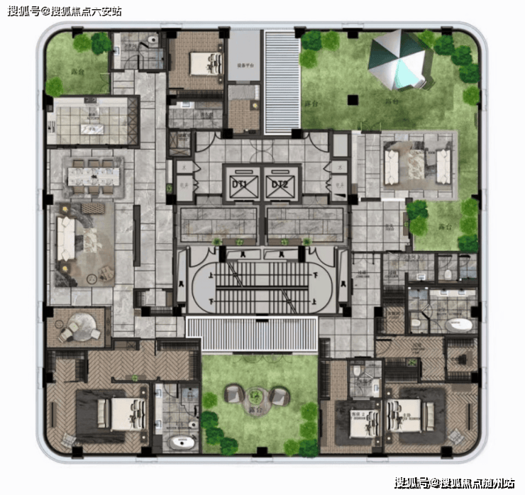 二楼带景观露台,顶楼空间则奢侈到夸张,490m²五房,一层一户送三个露台,比传统的300m²地上三层地下二层的别墅还舒服。因为别墅单层面积80m²,吃个饭楼上楼下跑,这里则是490m²摊在一个平面,因此这类顶楼大平层极度稀缺。