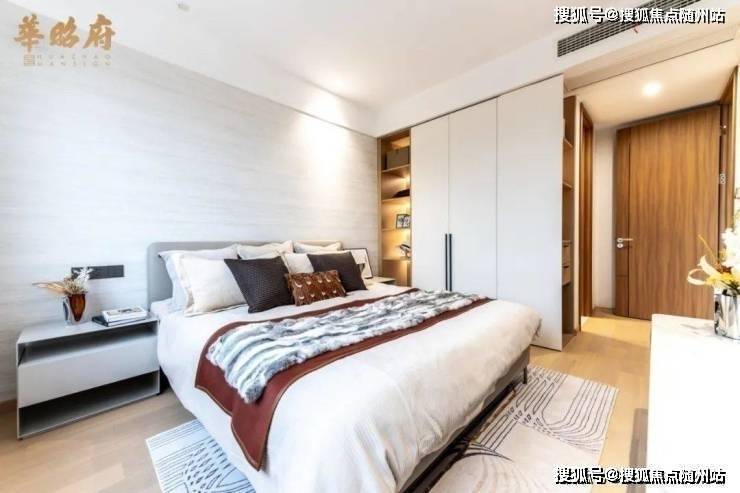 在样板房里,华昭府更是将高配进行到底。杭州市场上2万+的楼盘,全装修交付时墙面大多为白色乳胶漆,而华昭府的墙面采用精致温馨的墙布,客厅的电视背景墙也毫不吝啬,采用大块的岩板进行装饰。