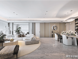 建面约 560㎡「归逸」重塑居住的精神维度,即空间不仅是物理尺度的延展,更是居住本质的一场深度探索。 约 8米进深的会客厅地面通铺珍贵石材,客厅背景墙选用意大利fendi白石材,大尺寸面积铺设石材纹路都做到完美拼接,如同一卷徐徐展开的绢本。