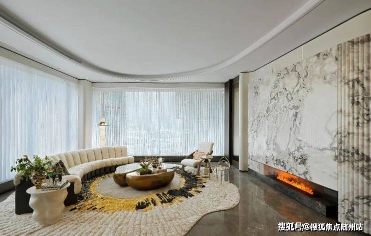潮博385m²的钻石厅,是去年的产品,沿用了梅西家同款的FENDI白大理石做了一道圆弧形背景墙,转角是工艺复杂的波浪纹,不仅造型独特,而且损耗极高,配合火红的壁炉、米白的钢琴键沙发,别致的水滴形吊顶与弧形PRADA绿奢石岛台交相呼应,升华了艺术氛围。