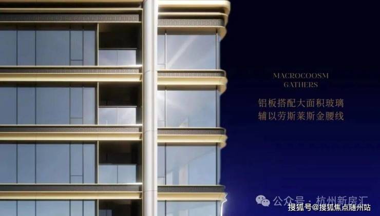 立面选用贝母白铝板,搭配劳斯莱斯同款香槟金色金属线条,再结合瀑布式“水晶灰”全景玻璃幕墙,不仅极大提升了室内采光与视野开阔度,更以灵动的天际轮廓,与杭州特有的江河韵味相融合,呈现出高级而耐看的建筑表情。