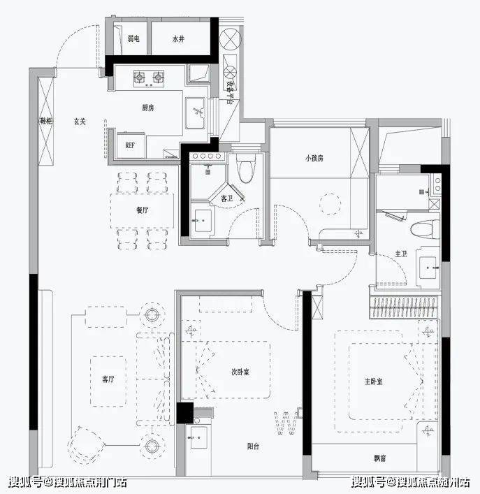南向的次卧与公卫保持了最短动线,老人或孩子住这间,不但能享受“阳光平权”,洗漱起夜也非常方便。