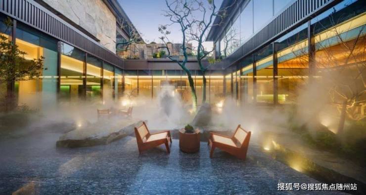 穿过景墙是下沉水院,连着售楼大厅和松林剧场,一边是水瀑潺潺,流淌成一幅古雅的宋韵山水画卷,一边是肆意舒展的罗汉松、老红梅、羽毛枫,铺展出悠远的东方意境。