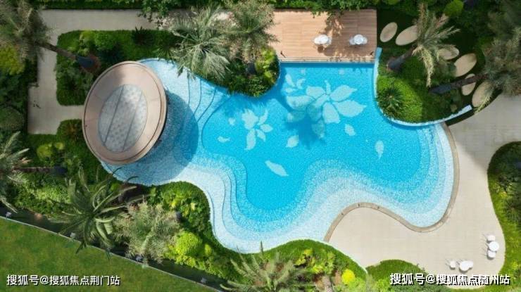 已经实景呈现的蒂芙尼蓝中心戏水池,水池边一道道弧形曲线,池底精致的马赛克拼花,透着满满的热带度假风,在配上水池旁挺拔的银海枣等热带植物,未来业主们往水池边一趟,仿佛就置身在东南亚的海滩边的高级度假酒店。