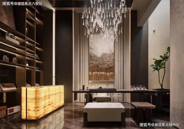 客餐厅采用一体化设计,通过石材、影木、皮革、金属、玻璃等不同材质在光影下的交织,形成张弛有度的现代轻奢多元的场景体验,内敛优雅,充盈着浓郁的都市质感。