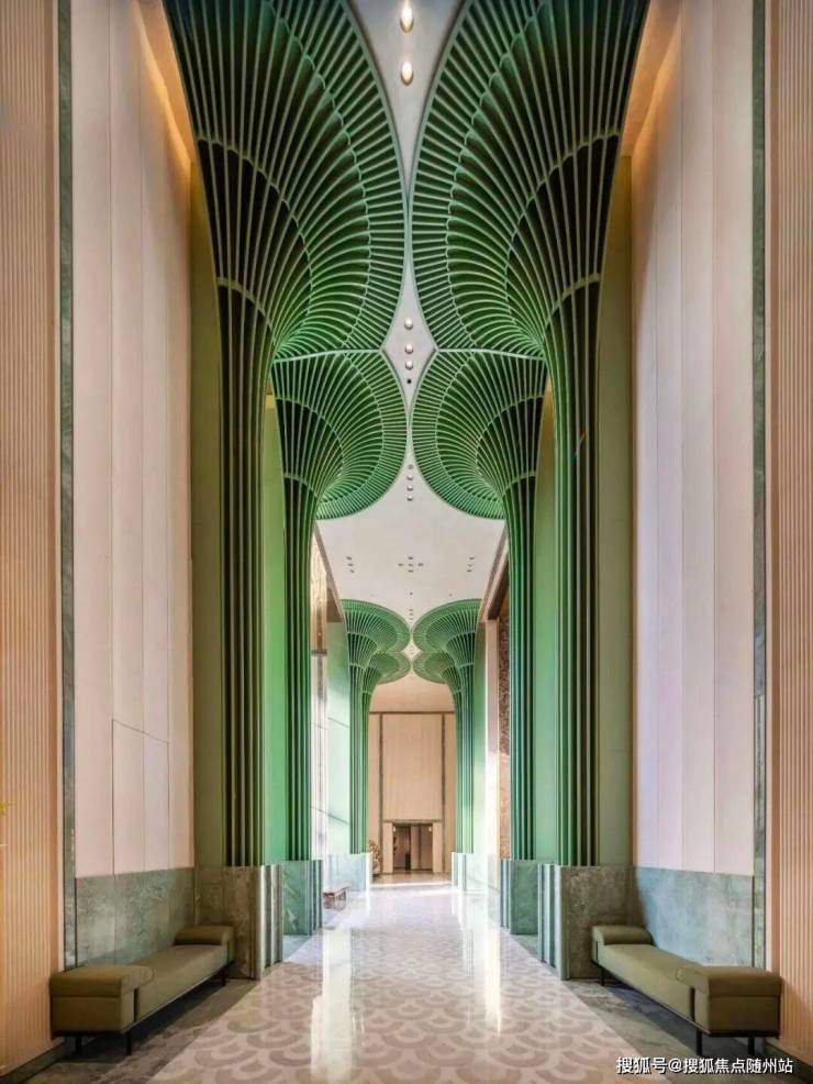 以杭州折扇为灵感而造的超尺度门庭,12片巴西进口百达翡绿玉石屏风,由非遗传承人朱炳仁团队打造的巨幅铜门,“玉镜流光”雕塑,大堂内八根巨幅立柱,还原了扇骨的形态,汝窑冰裂纹的陶片镶嵌,地面拼花运用江南花窗元素……
