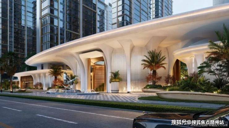 项目的北面紧挨着河道,主要出入口位于西面景兴路,,通过钻石型大堂进入下沉式庭院。南面思凯路上也有车行入口,做了景观构架。项目内部整体采用首层抬高的设计,打造了多层级豪华水系景观,全区风雨连廊连接。