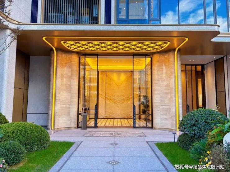 高层单元入户门厅,同样走的是老钱风。夜幕降临的时候,暖黄色的灯带,搭配香槟金铝板和进口石材,整个奢华感拉满。