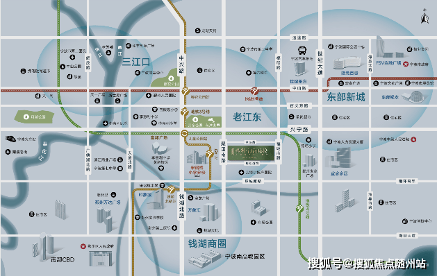 地处宁波市鄞州区老江东板块,位于江东、东部新城、鄞州三大板块交汇处,周边交通便利,临近地铁站点,且与约2万方市政规划公园相邻,地理位置优越。