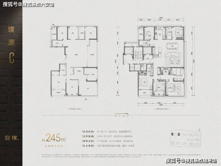 建面约245㎡的边厅户型,则在主卧留出了270°转角窗,在晨昏之间捕捉窗外美景与光影流动。