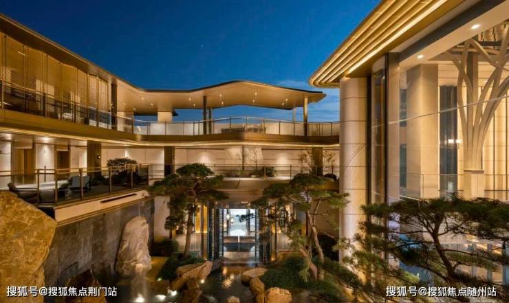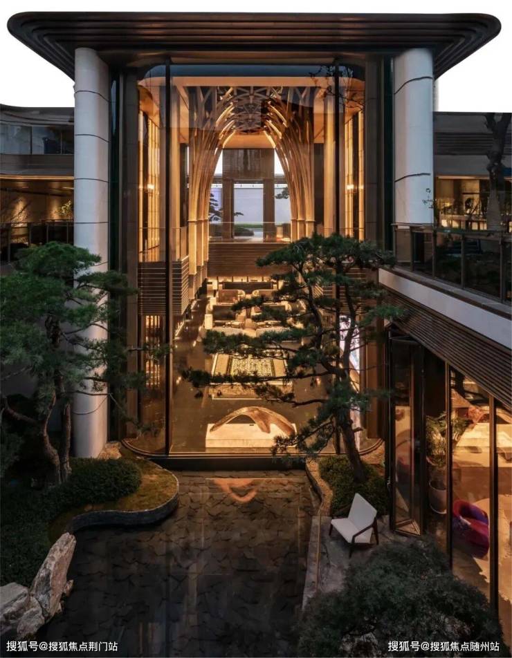 景观以「四境四巷」铺陈东方礼序,「五重归家」轴线串联宽约128米恢弘门庭、约15米叠石飞瀑、约13米榫卯转译的现代穹顶等。约1300㎡下沉式庭院采用三层立体观景设计,15米叠石飞瀑再现《溪山行旅图》的山水意境。