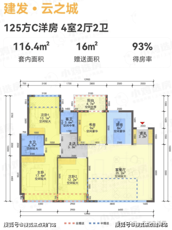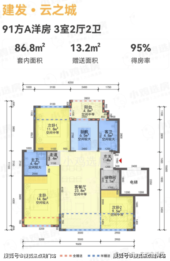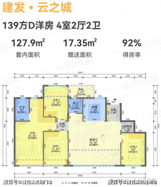 108方样板房:真南北通透、3+1设计(区别市面2+1户型),北侧无消防连廊;入户标配储藏间;四叶草户型布局,各功能空间划分细致,家庭成员生活互不干扰。