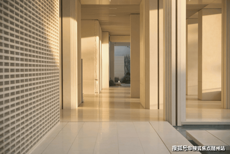 示范区建筑体采用的是米白色的莱姆石镶嵌超大玻璃,莱姆石在阳光的照耀下仔细一看有母贝的光泽效果。把光影作为设计语言引入,让建筑显得纯净,却又不失现代感。