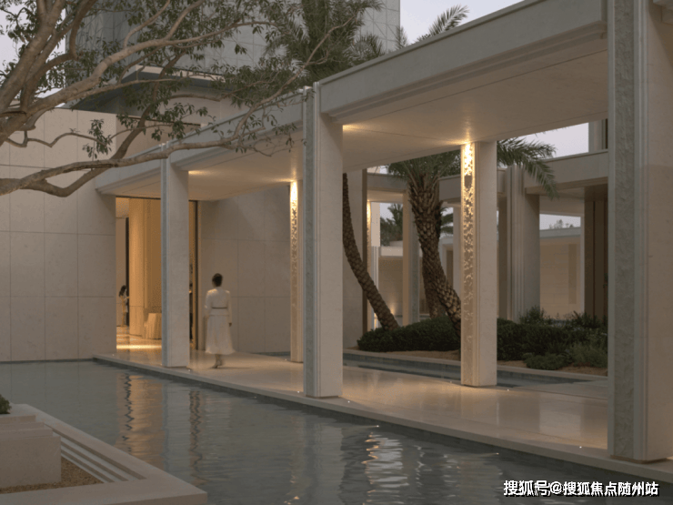 架空层观景平台上,柱廊、水庭与树影交融成诗,喧嚣在光影流转间被时光温柔稀释。归途于此,以水之哲学,成就无界的心灵栖居。