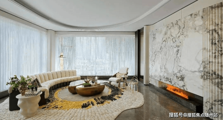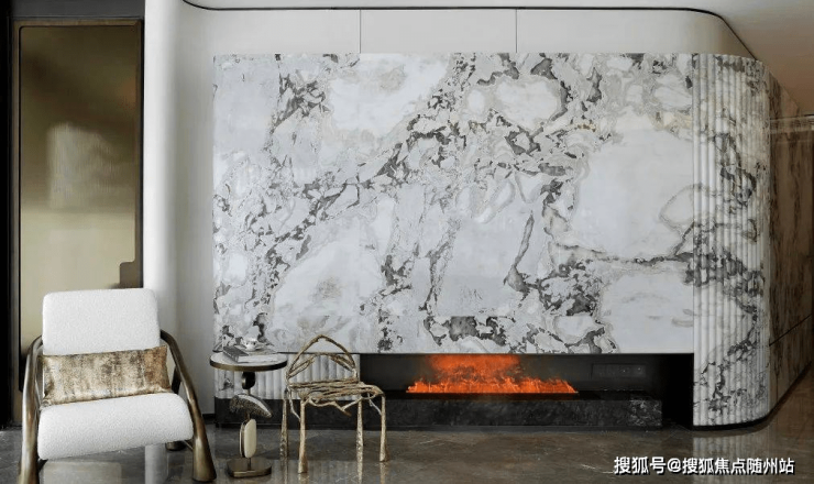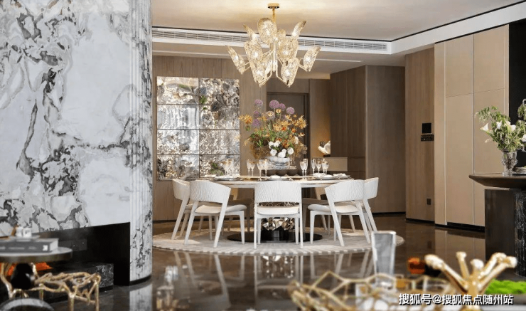 除了设计上的匠心灵感,也有源于大自然的古朴本真。为塑造更具美感的室内公区空间,CCD从众多石材中精心挑选芬迪白大理石,瑰丽柔和的纹路,点睛整片空间。由特色普拉达绿雕琢而成的独立岛台,经过二次切割再打磨,材料损耗度较高,其独特的圆弧造型,只为呈现尊贵品质与更多样体验的可能。