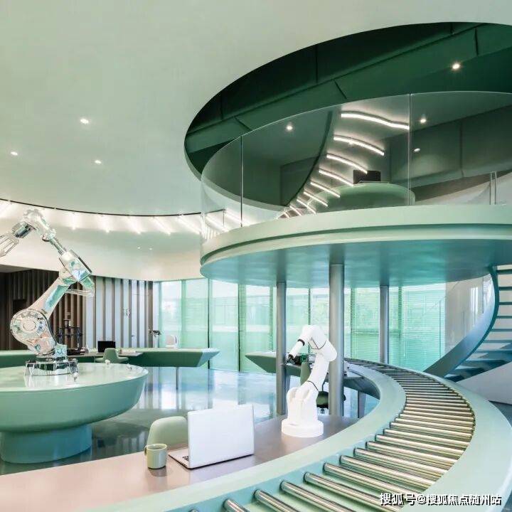 首层大堂以延展的天地线条引导视线,悬浮式会议室以极具张力的造型,直观传递“创意生于交流”的设计理念。