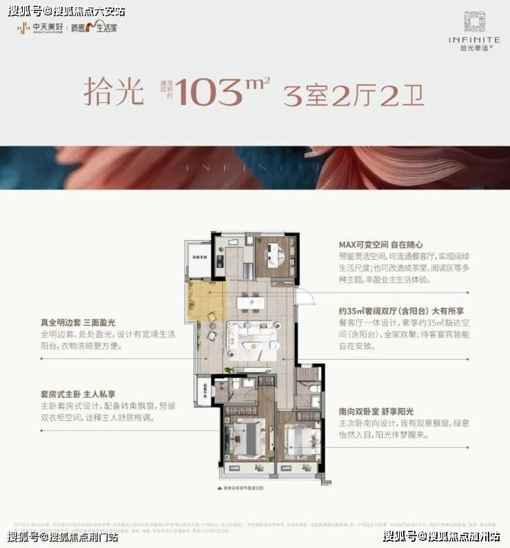 如建面约103㎡的拾光户型,阳台内包加三面采光的设计,无限延伸室内空间格局 ,时刻沐浴在阳光之中,感受清风拂过;阳台、客厅、餐厅一体打通,形成一个家庭版的“超级聚厅”,宴请亲朋小聚,或举办孩子生日party,甚至是小型音乐会……