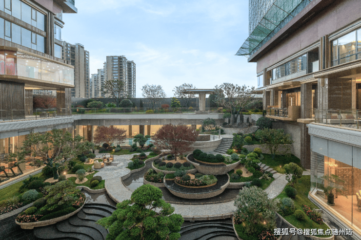 在社区内部,潮语江澜府进一步强化了高端住区的体验感。园林设计以“一环两心五重园”为理念,打造出近2.5万平方米的高奢酒店式园境,将自然景观与生活场景有机融合,营造出静谧而富有层次的归家动线。