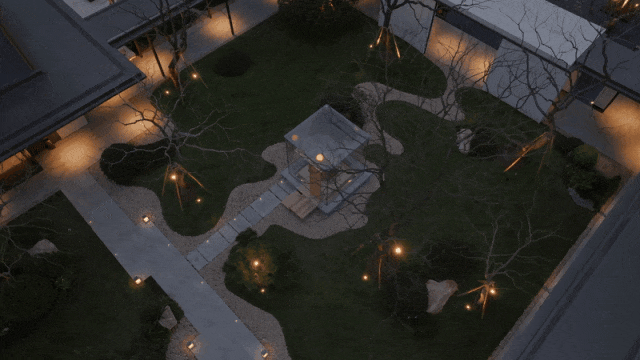 踏进项目,首先映入眼帘的是一座悬浮于镜面水院之上的森林景观。整齐对称的悬浮树阵,与更显品质的厚重门头呼应,营造出极具仪式感的酒店式尊享归家氛围感。