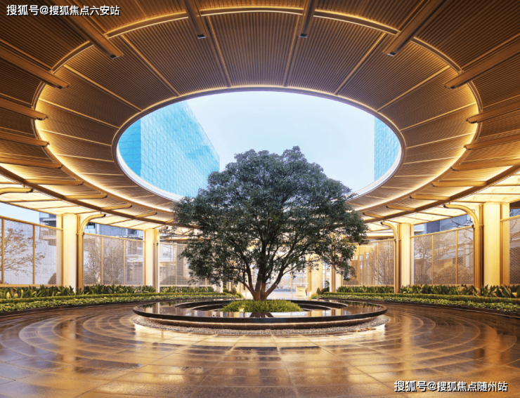利用高差打造下沉庭院,结合瀑布与观景平台,贝家桥港绿带构成滨水景观,实现“出则繁华、入则宁静”。