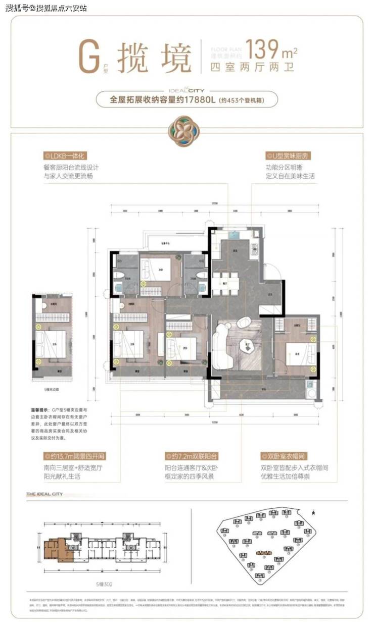 主力户型96-168㎡,得房率高达83%。109㎡三房采用7.2米横厅+双阳台设计,139㎡四房实现LDK一体化布局,南向面宽12.8米。部分户型设270°全景窗,提升采光与视野。