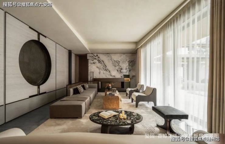 材质考究:地面铺设月光灰大理石;背景墙以卷轴形式展开,饰以烟雨江南大理石,呈现精致宋韵的生活质感。
