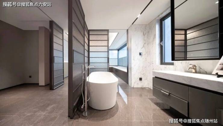 主卫不同于以往,采用了三分离的设计,另外还带有浴缸、双台盆,并且有完整的洄游动线,洗完澡后可以直接推开南面的移门。