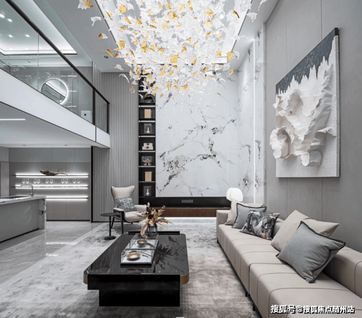 地下二层的会客厅是真富丽堂皇,大挑高的空间配上大吊灯,调性十足;高5.1米的巨型岩板使空间看起来很灵动。当然,所有装修风格以业主的主观意识为主,项目整体以毛坯交付,可以顺心而为。