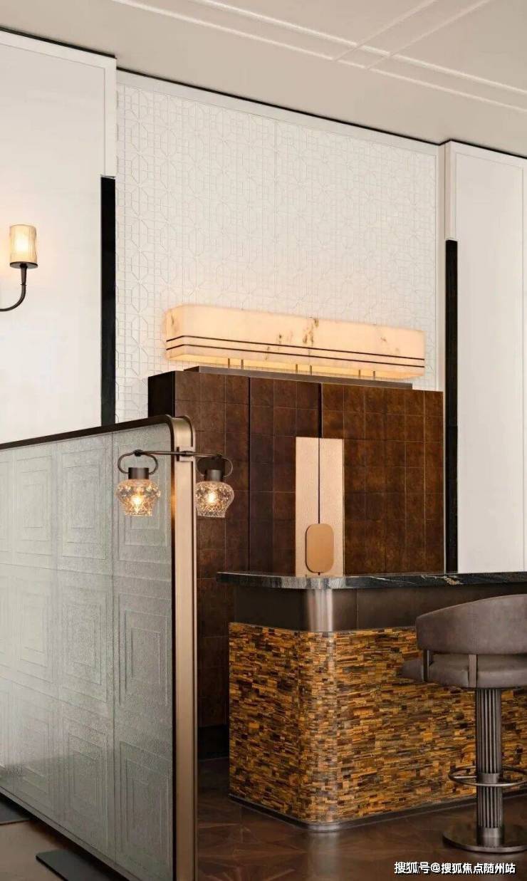 走廊的墙面材质十分优雅,壁灯照亮细节,玻璃幕墙增加光线的通道,细节点缀奢华。