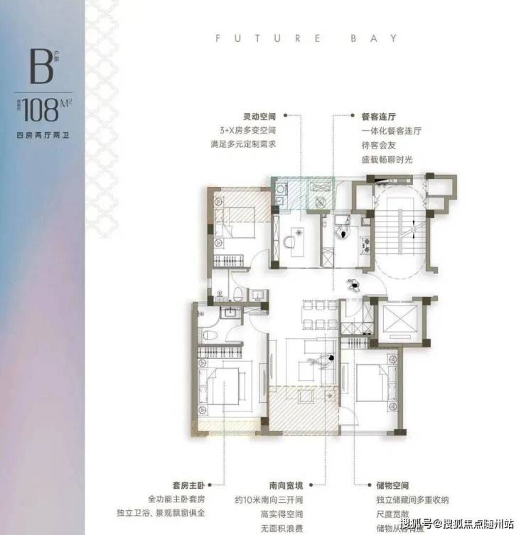 约108㎡的户型则设计了3+X灵动空间,无连廊确保南北通透,采用四叶草布局,卧室分布于四角,互不干扰。