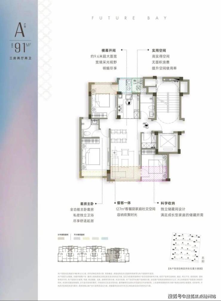 以建面约91㎡的户型为例,它做到了三房两厅两卫,且为真三房南北通透设计。