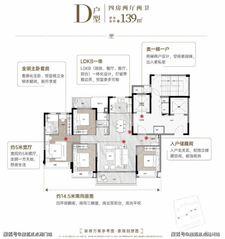 建面139㎡户型,客厅超5米的南向四面宽,大开间短进深设计,主卧带L型转角飘窗,独立全明衣帽间,尊贵感强。建面约160㎡户型南向超15m,四房三卫格局,L型步入衣帽间,更好的私密感。