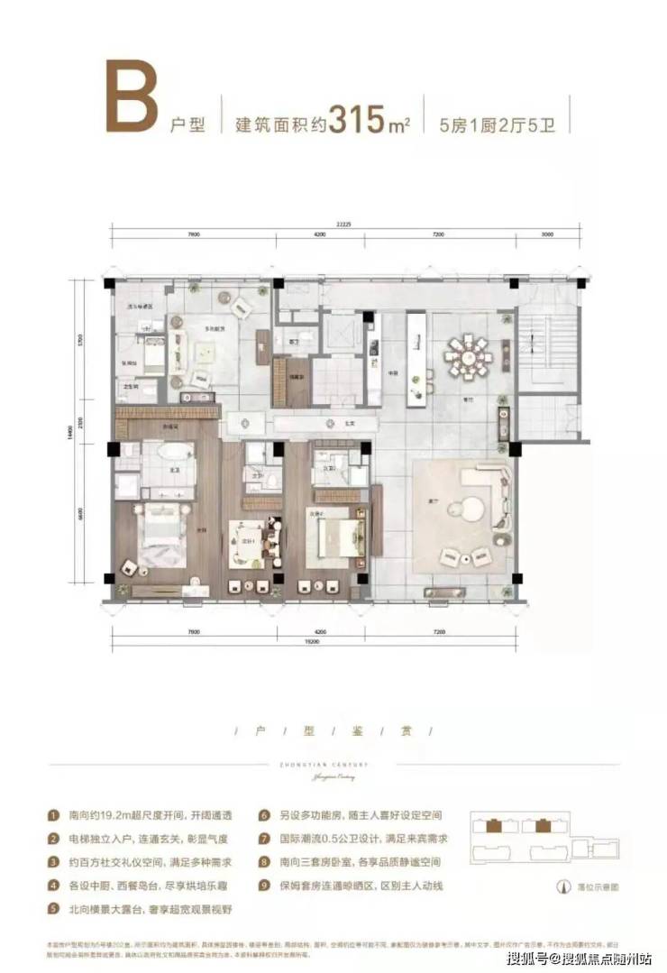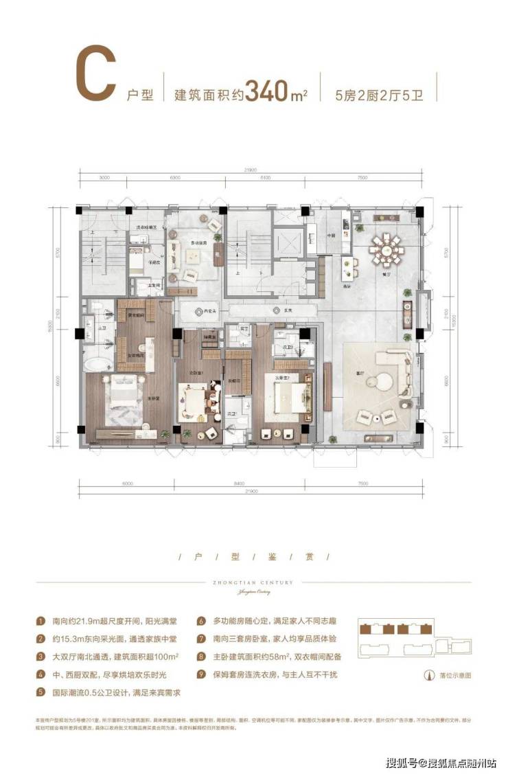 和市面上的其他宽景平层不同,HCC中天纪并没有在300多方的空间里规划出5-6个房间,而是保留了约100方空间作为公共社交空间,完全满足了商务、办公、居住等多重需求。由于公共社交空间被扩大了,因而整个房间的视野和采光面就被大大拓宽了。以C户型为例,四开间朝南,南向的总开间有近22米,西面还有15米的采光面。