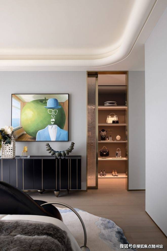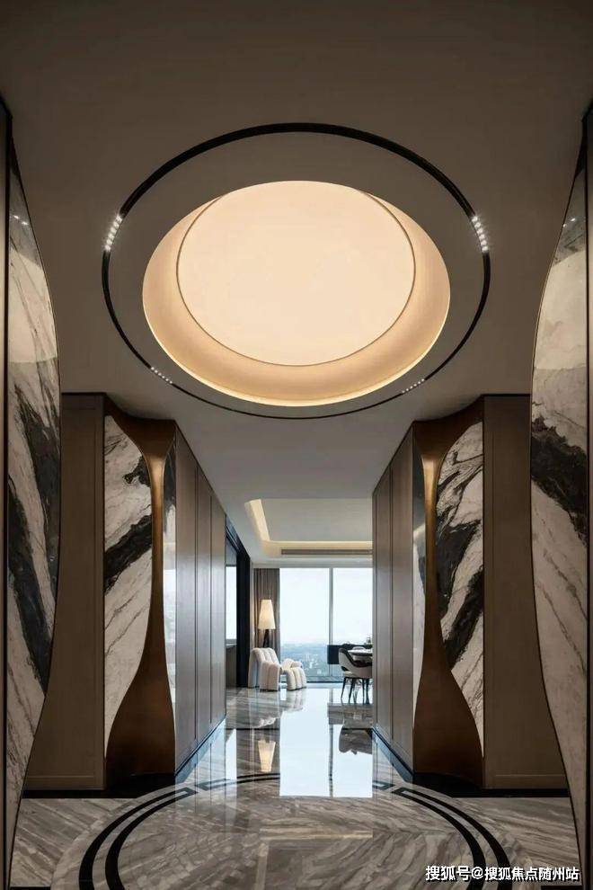 约300㎡“观湖”,谢柯打造;另一款是更宽舒的约412㎡“行云”,出自邱德光。尤其是约412㎡“行云”,无论玄关处雪花白、劳伦黑金、金世纪的大胆拼花,瓦楞式的波浪形电视背景墙,还是吸睛的普拉达绿石材吧台,全屋随处可见出色审美和奢华材质的完美结合。