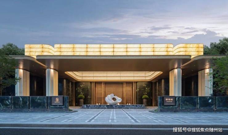 如山茶花般的定制石雕,映衬厚重的朱氏铜门,配上两侧大面荷塘月色奢石、铂金钻石材景墙,远远望去,宛如歌剧开幕时垂坠的天鹅绒帷幔,打开归家的仪式感。