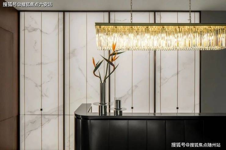 两侧木饰面,初看无奇,但走近一看,上面不仅有自然纹理,每一段木饰面还“拗出”微曲面造型,加上灯带的渲染,墙面也不再单调。套内空间的背景墙,从底部到顶部是一水连天的皮革硬包,精致好看,当然造价成本也很高。