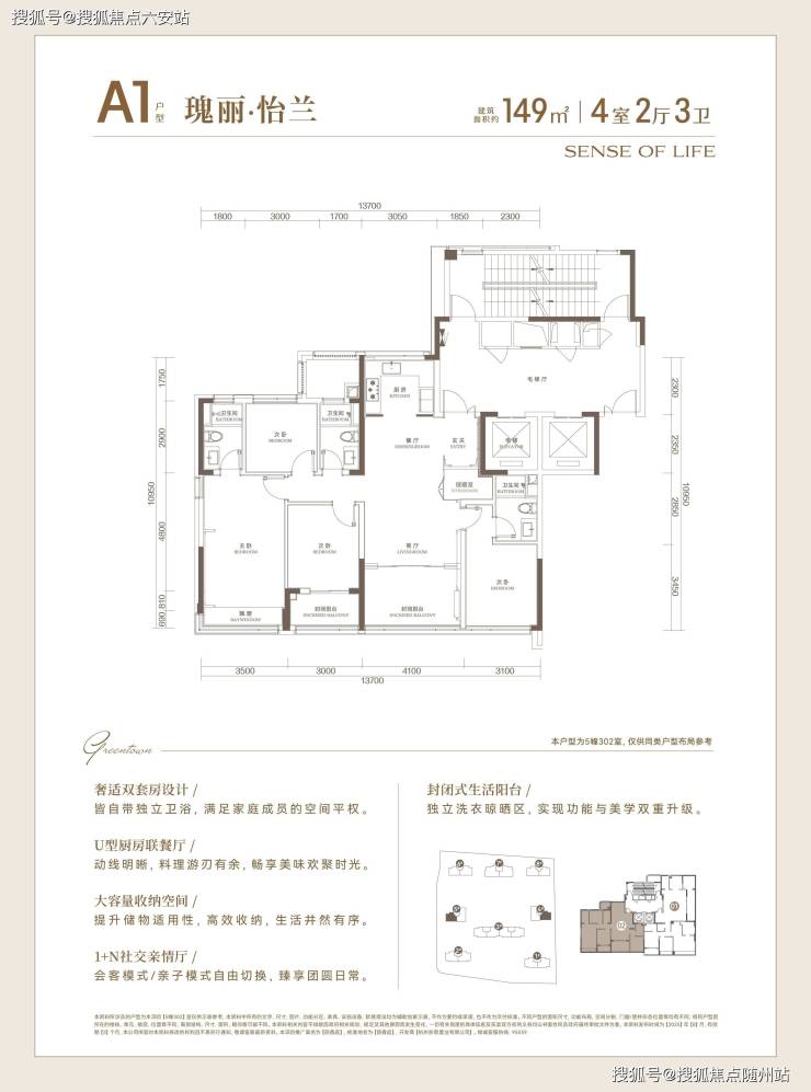 建面约149㎡户型作为项目主力户型,采用四开间朝南+南向双套房+独立储藏室的设计,所有卧室与卫生间皆以最短动线布局。这一户型是奥体在售仅有的149㎡入门级改善四房,兼具实用度和流通性。