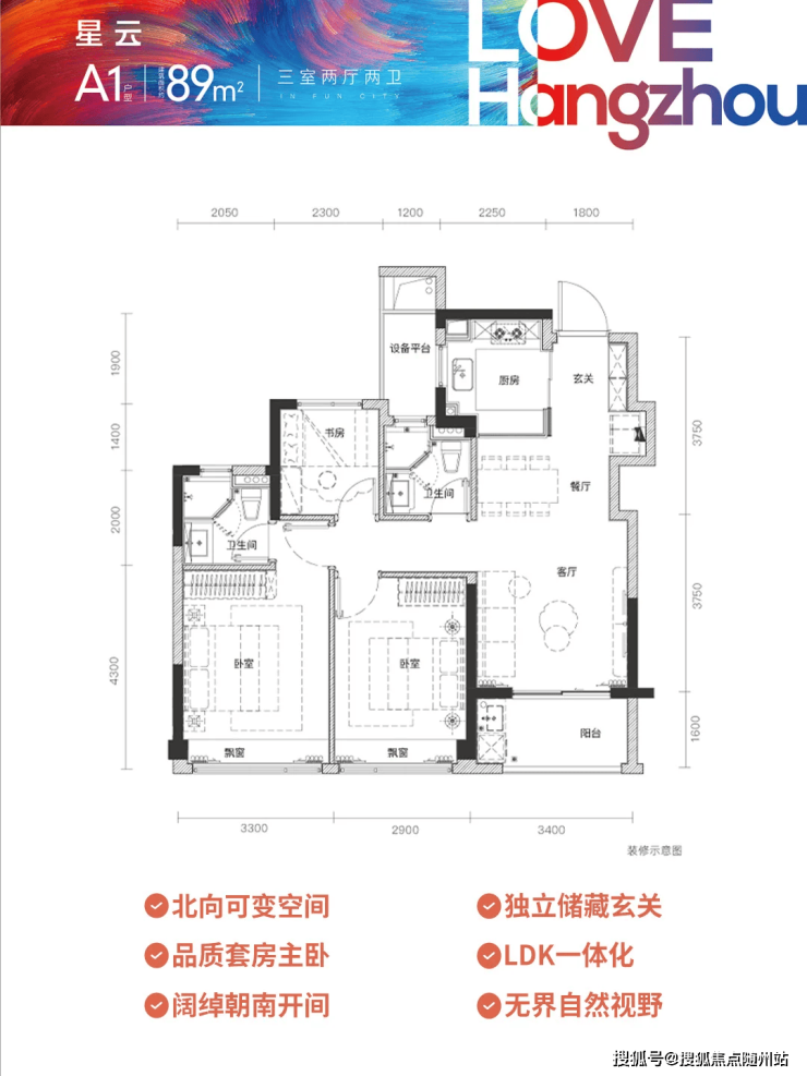 约6米宽景阳台衔接LDK一体化空间,书房可变儿童房,满足成长型家庭需求;