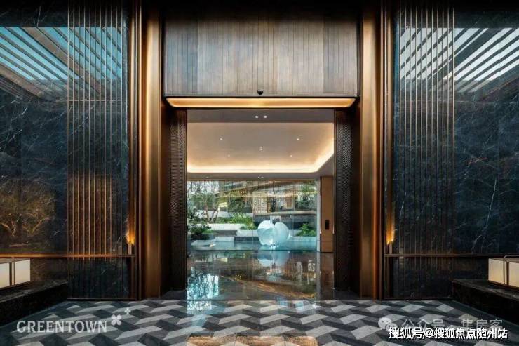 主入口知·云栖,取意西湖十景以"洄游"为理念,超52米跨度的回字形布局,重构传统"四水归堂"空间序列,约2.4米“流光礼宾” 塔冠,如悬浮的美学灯塔,与金色挑檐相映成辉,全封闭式阳台勾勒建筑轮廓,让立面如镜幕般收纳约30公里江岸鎏光!