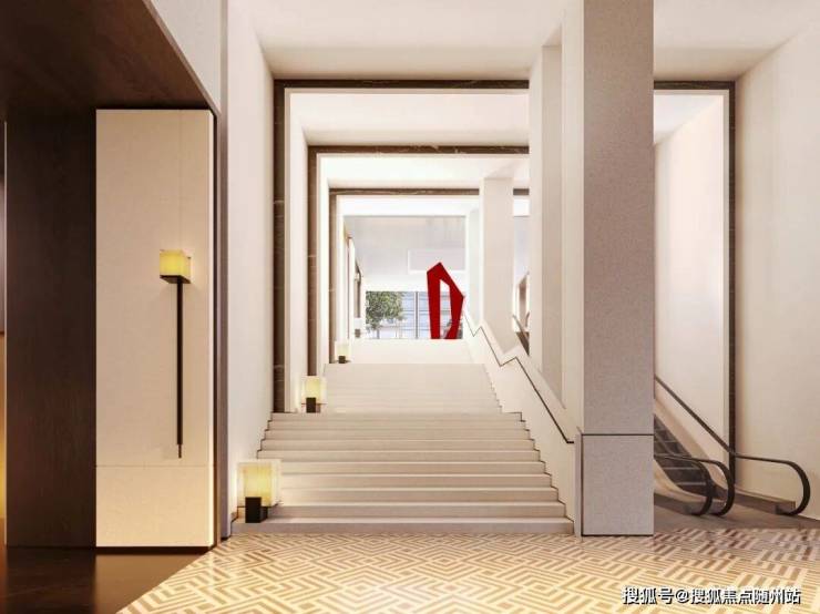 沐芳洲解决了抬高式项目从地面G层上到平台架空层的最佳动线方案。你可以有两条上升之路,一条是选择自动扶梯缓缓而上,另一条是踩着像通往圣殿般的台阶一步步拾级而上,每一步都能踩出艺术感。