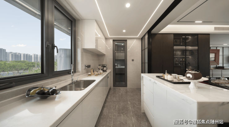 步入室内,超70㎡的社交生活主场,足以承载家庭欢聚、老友宴请等多元场景,是主人气度的最佳彰显;中西双厨的可变式灵活设计,兼顾了中式家宴的烟火气与西式烘焙的仪式感,独立家政阳台则一站式解决洗衣、晾晒、储物需求,让居家空间整洁有序。