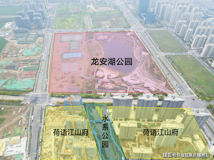 走进楼盘,东西地块之间有一条天然水系公园,北边连着龙安湖公园。