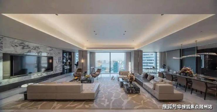 客厅以米灰为基调,大理石电视背景墙如凝固时间的山水,成为视觉锚点。空间光源的布设,使其指向性和漫射性交替出现,在不同时段呈现出多层次光感。