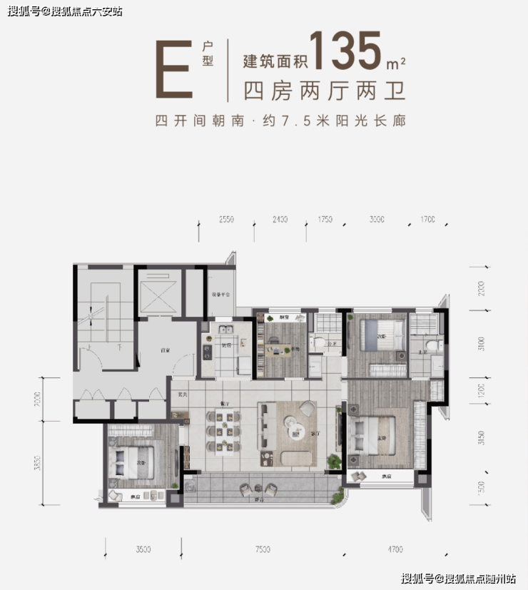 建面约135㎡的四房户型加入了当下很流行的横厅设计,餐客厅7.5米的大面宽,还配有南向的阳光长廊,同时得益于横厅设计,室内几乎没有无用的走廊空间,空间利用率很高。