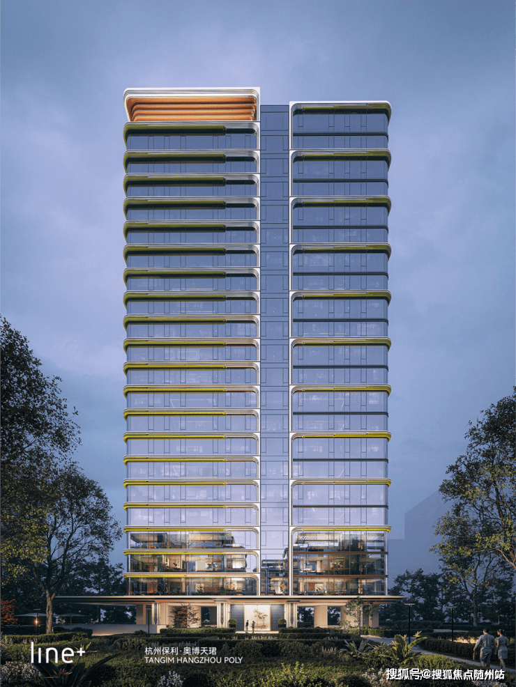 建筑布局南偏东15°错位排布,优化日照与江景视觉联动,形成“千浪之树”沿河景观带,呼应钱塘江潮汐意象。立面设计大量运用弧形和曲面,柔化建筑的刚硬,赋予空间流动的美感,标志性的玻璃折角打造了“第五重”立面。