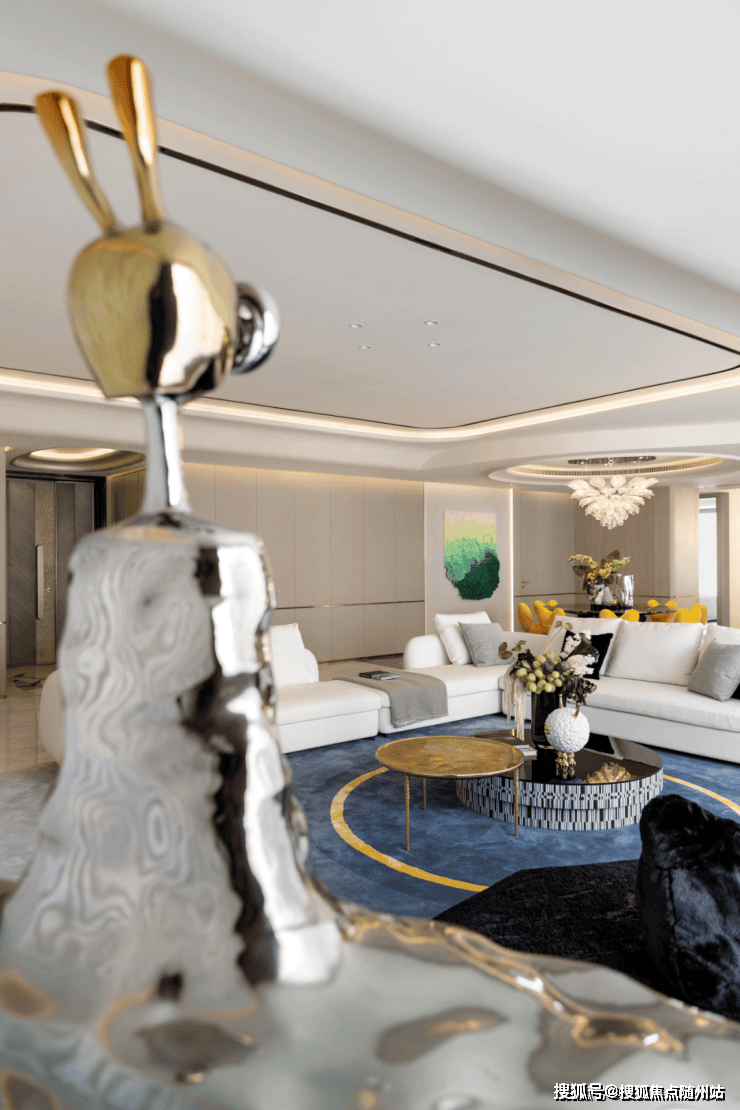 比较开放空间的不同因地制宜,在原始建筑平面基础上,我们采用「化整为零」的空间处理法,将阳台纳入室内,扩大原有公区面积,释放空间边界,打破动线区隔,形成一体化的“双客厅”概念。客厅、餐厅、LOUNGE、中西厨、艺术品整体呈开放式布局,公区空间大气灵动。