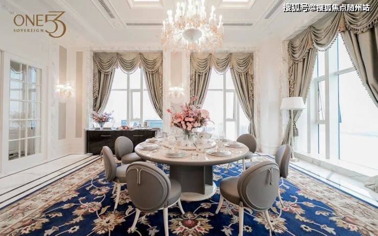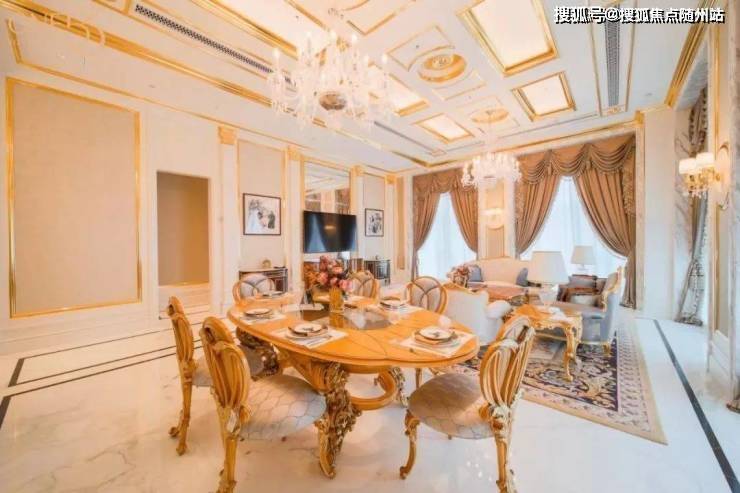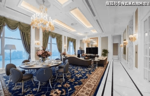 配上白色的石膏吊顶和本白的护壁板,以及3米多高的大落地窗,房间里充满了一种“空气感”。恢弘的客餐厅里,Baccarat的枝形吊灯在格子天花板高悬。爱奥尼壁柱间,边框贴满24K金箔的Interna装饰镜熠熠生辉。它有着新古典的所有华贵元素!